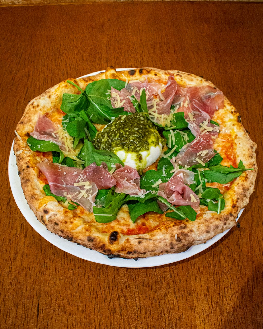 Pizza com molho de tomate pelado, mozzarella, finalizada com rúcula, presunto cru, parmesão ralado e uma generosa burrata coberta com pesto de manjericão por 107,00 reais.