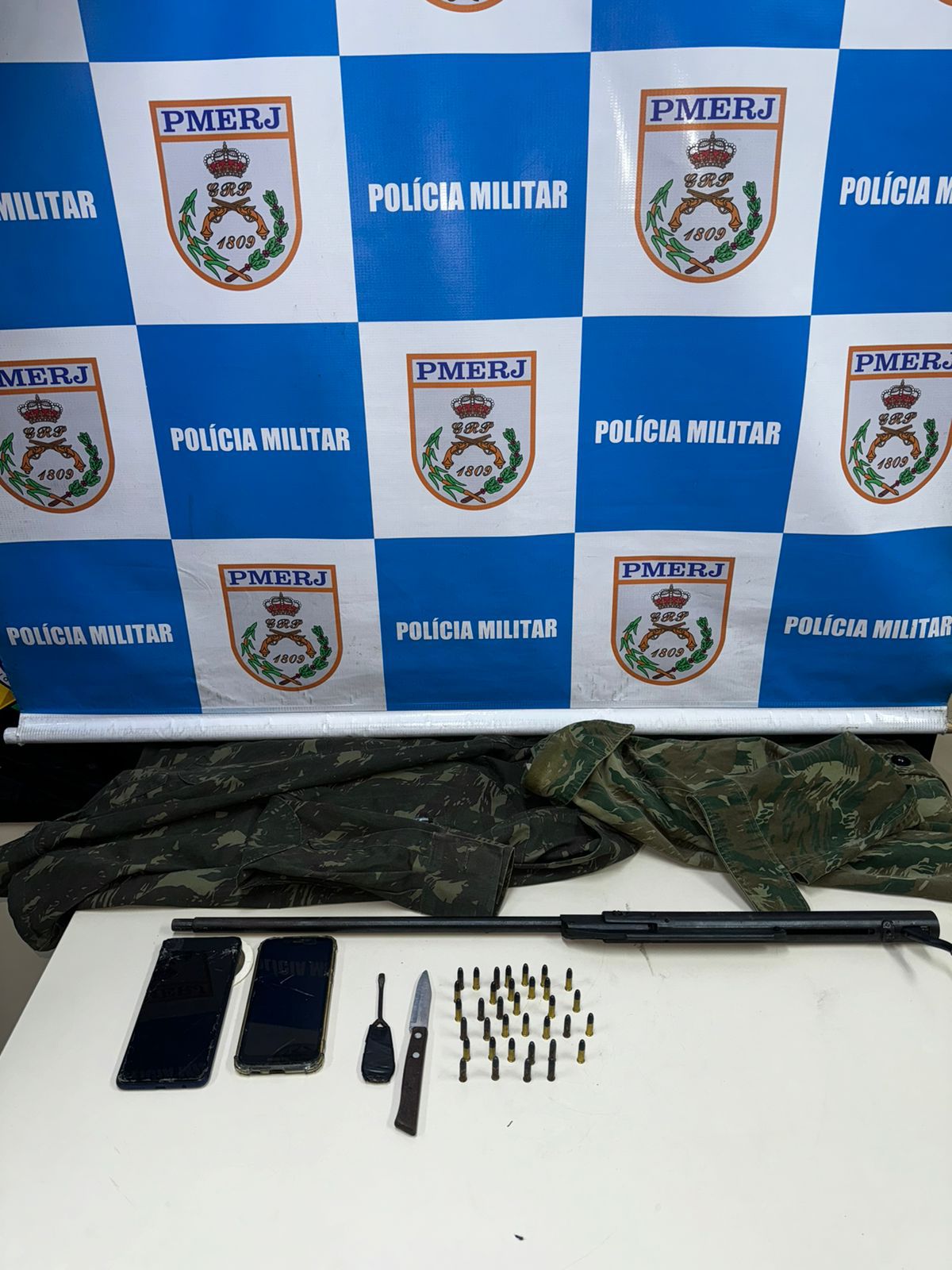 De acordo com a corporação, a guarnição foi acionada para verificar denúncia de abuso contra uma menor. No local, a mãe da vítima indicou o endereço do suspeito, que foi localizado e abordado. Com ele, os policiais encontraram uma espingarda calibre .22, 34 munições, duas gandolas camufladas, dois celulares e uma faca.